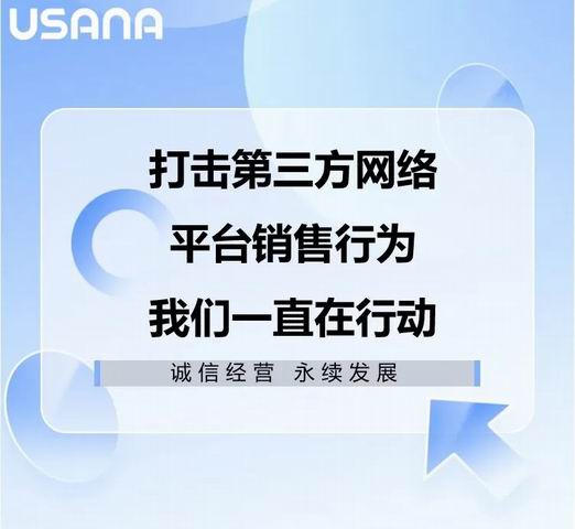 郑重声明USANA葆婴作为一家健康产业的品牌企业,多年来始终坚持诚信经营的价值观,并与我们的业务伙伴一起为实现“成为世界上最健康的大家庭”的愿景而努力。一直以来,USANA葆婴致力于打击第三方网络平台销售低价及假冒伪劣USANA葆婴产品等违背商业道德及违法违规的行为,我们对此类行为始终坚持“零容忍”的态度,一经查实即严肃处理!让我们与伙伴们一起,共同抵制在第三方互联网平台,销售低价及假冒伪劣USANA葆婴产品的行为。我们会以诚信的态度,为消费者提供优质产品和客户服务,共同维护优莎纳葆婴的美好信誉和优质品牌形象。