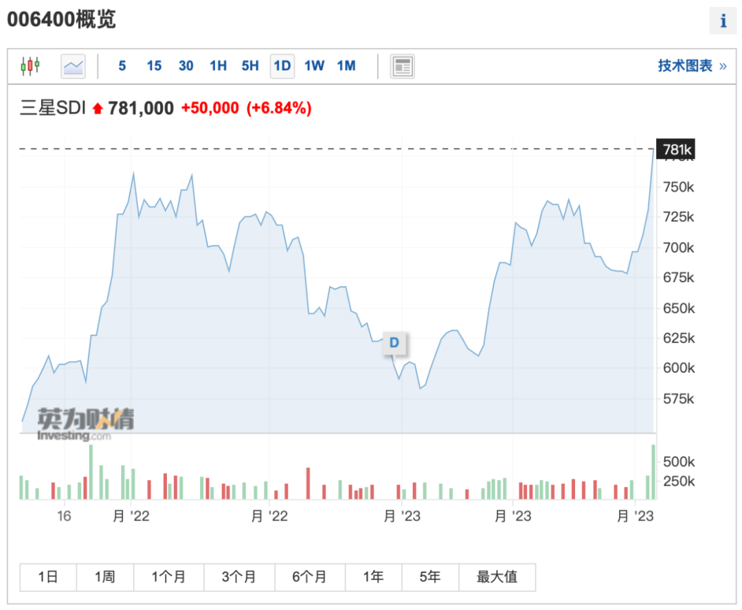 受该消息刺激,三星SDI股价于3月6日大幅拉升,截至收盘,涨幅达6.84%,最新总市值攀升至48.3万亿韩元(约合人民币2600亿元)。