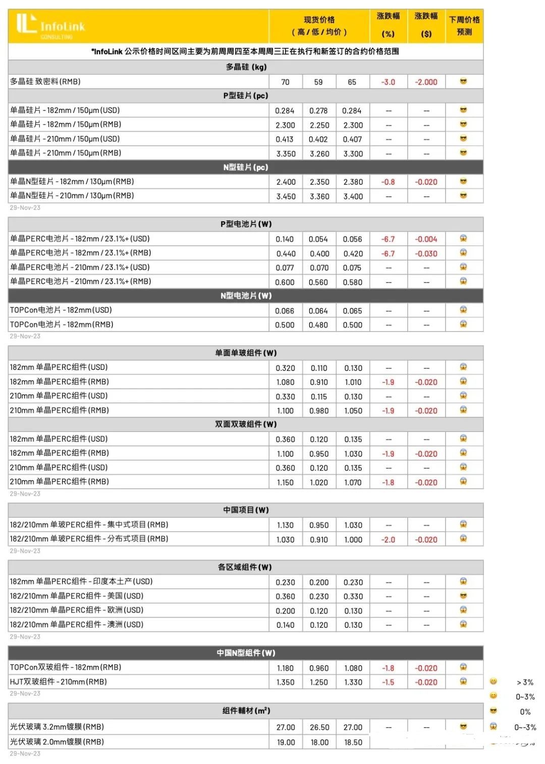 硅片环节整体价格在当前微薄盈利空间下走势平稳,在供需方面皆呈现短暂的稳定,考量下月电池厂的排产恐将出现大幅变化,本周买卖交易氛围相对平淡,市场静待12月份供应链新一轮的价格竞争。