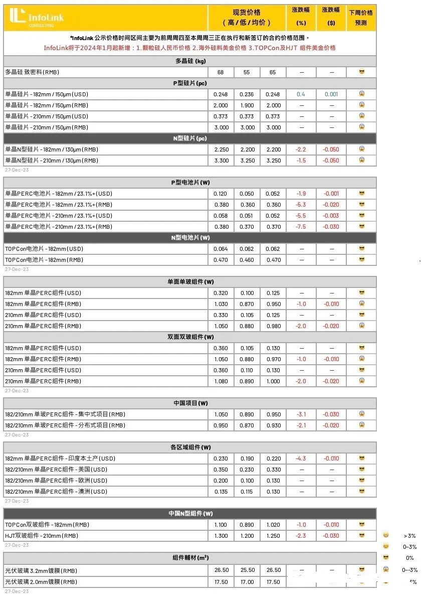 随着年末的到来,硅片环节采购陆续收尾,整体价格相对持稳,个别规格仍在持续下行。