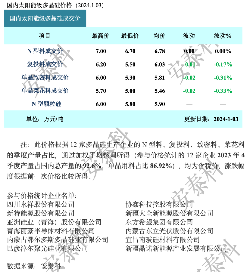 本周n型硅料有4家企业成交,p型硅料有6家企业成交。本次价格统计期间包含元旦假期,对企业签单有一定影响,部分企业仍在洽谈订单,预计近期仍有一定规模成交。
