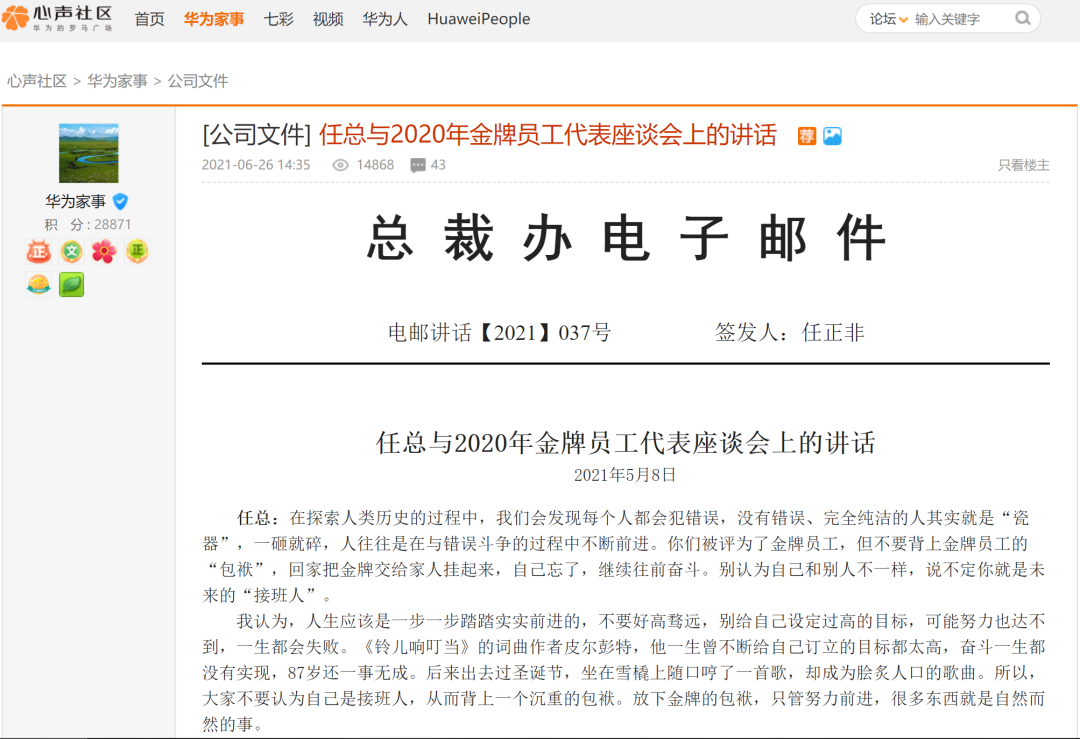 6月26日,华为心声社区公开《任总与2020年金牌员工代表座谈会上的讲话》,讲话时间为5月8日。任正非在讲话中谈及内卷、美国打压、员工海外工作环境、人生目标,还顺带推荐了一部电视剧《觉醒年代》。