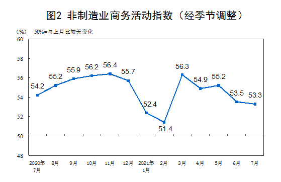 7月份,非制造业商务活动指数为53.3%,略低于上月0.2个百分点,仍持续位于临界点之上,表明非制造业总体保持平稳扩张。