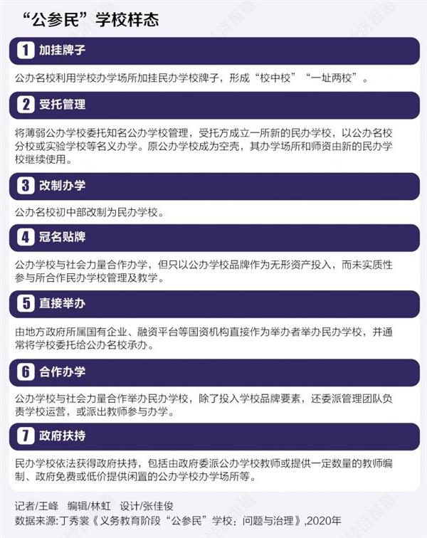 通知指出,“公参民”学校主要包括三类:公办学校单独举办的义务教育学校;公办学校与地方政府及相关机构(含具有财政经常性经费关系的其他单位、政府国有投资平台、政府发起设立的基金会、国有企业等)合作举办的义务教育学校;公办学校与其他社会组织、个人合作举办(含公办学校以品牌、管理等无形资产参与办学)的义务教育学校。