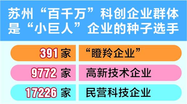 记者获悉,苏州目前已形成以新一代信息技术、高端装备、新材料、新能源、生物医药等行业为代表的新兴产业集群,培育产生了“百千万”(391家“瞪羚企业”、9772家高新技术企业、17226家民营科技企业)的科创企业群体,其中不少是细分领域的头部企业,这都是专精特新“小巨人”企业的种子选手。