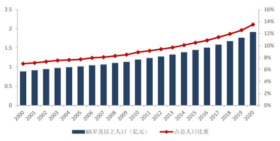 我国从2001年初步进入老龄化社会,当前我国老龄化正在加速。根据国家统计局数据显示,2020年我国65周岁及以上老龄人口达1.91亿人,占总人口的13.5%,已逼近深度老龄化。
