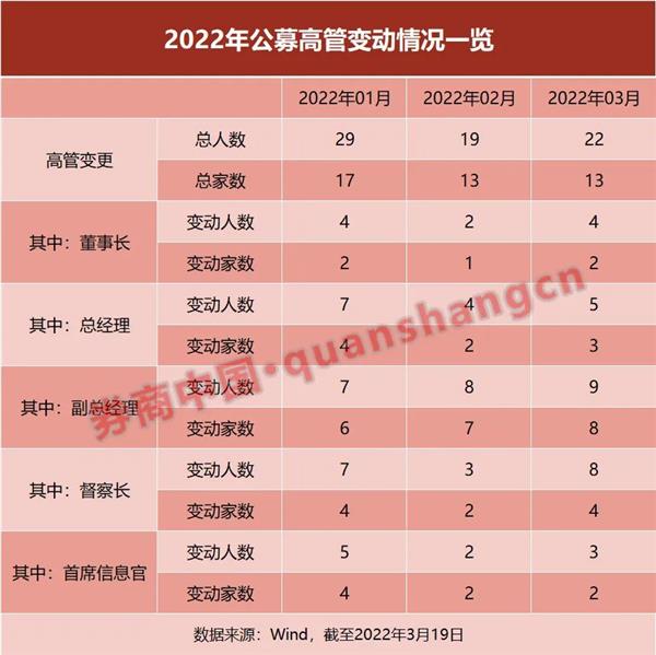 Wind数据显示,截至3月19日,2022年以来已有70位基金高管变更,其中涉及董事长职务的有10人,涉及总经理职务的有16人,涉及副总经理、督察长、首席信息官的分别有24人、18人、10人。
