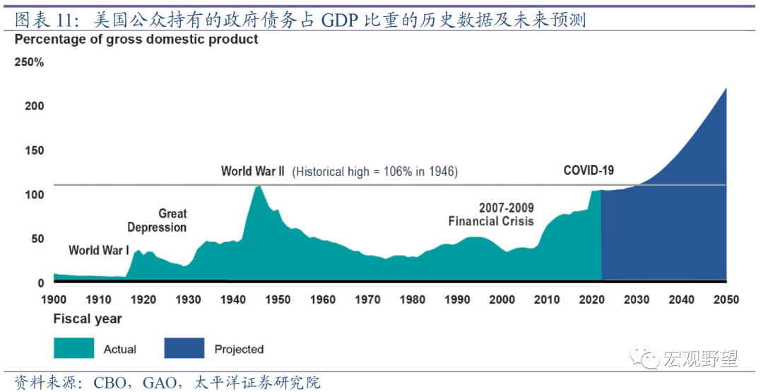 美国政府问责局(GAO)测算指出,如果不加控制,美国由公众持有的国债总额占GDP的比重将在2030年左右突破二战时的历史高点,并在之后加速上升,远远超过经济增长的速度。同时GAO指出,如果利率水平上升的速度快于预期,则这一时点会提前到来。而2022年就是利率上升幅度远超预期的情况。所以,当前美国的货币政策和财政政策的组合已经处于不可持续的状态。解决这一困境只有三种渠道:一是美国经济增长率出现大幅度的跃升,从而降低债务率;二是收缩财政支出来降低债务水平;三是降低利率水平以缓解债务压力。目前来看,全球仍然处于康波周期的下行期之中,并未出现新的经济增长引擎,所以美国经济增长率出现跃升的概率较小。解决债务问题还需依靠财政政策和货币政策的配合。