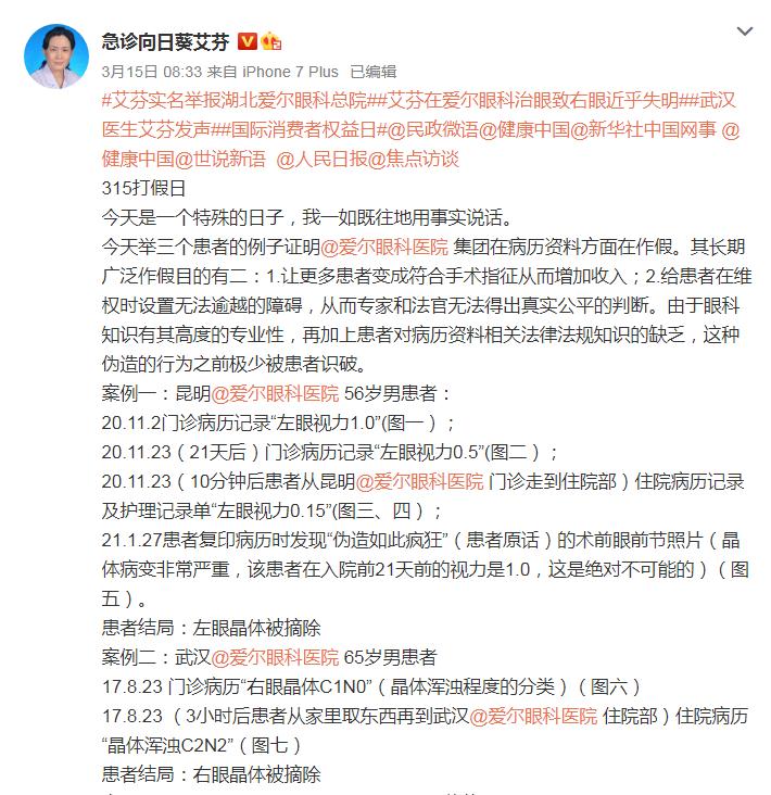 3月15日,艾芬再次发微博,列举了爱尔眼科的三个篡改病例的案例。双方各执一词,事件依然悬而未决。