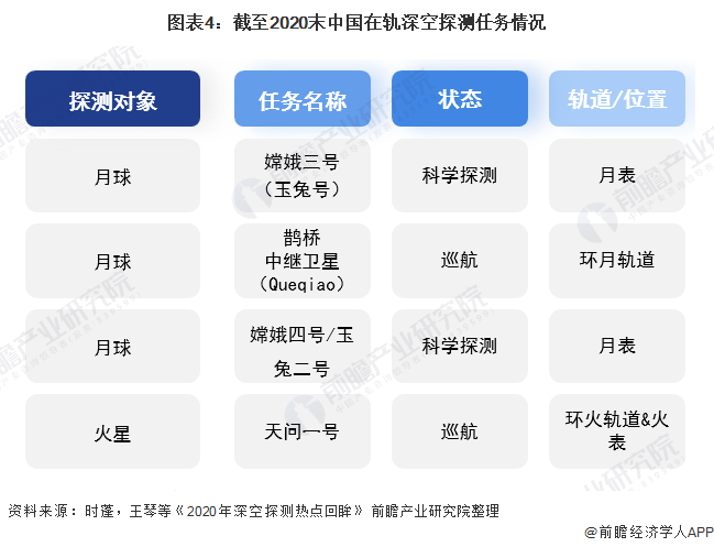 “十三五”时期,我国首次火星探测任务(天问一号)正式实施。截至2020年末,全球在轨深空探测任务共计35个,其中中国在轨深空探测任务共有4个:
