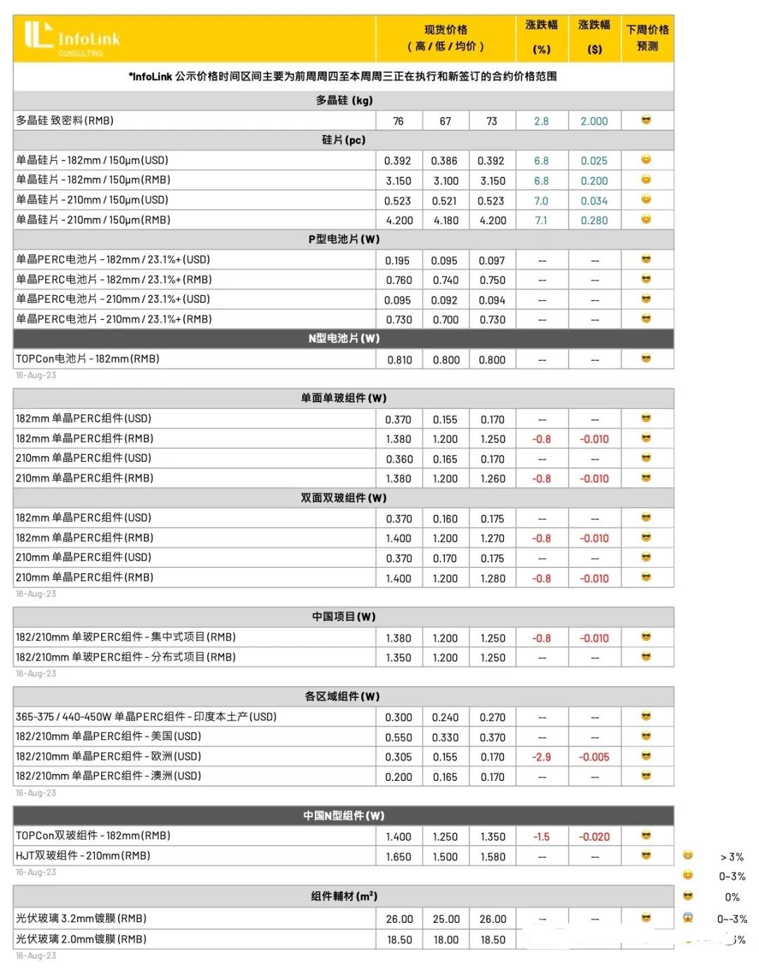由于当前售价对于外采电池片的组件厂家来说已难拥有盈利空间,近期也陆续传出组件厂家规划减产,甚至其中也不乏一线组件厂家,迭加组件辅材料如玻璃等价格也在上行,预期当前电池片价格已濒临相对顶点,下周走势维稳看待。