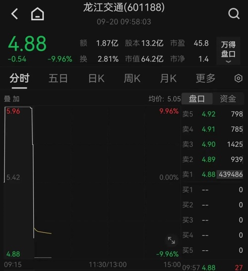 龙江交通曾创下6天5板的战绩。20日早盘,该股集合竞价时仍在涨停价,开盘后直线下挫,截至发稿仍被摁在跌停板上。