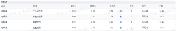 证券之星新能源车行业周报:据上海有色网,截止10月27日,电池级碳酸锂16.10- 17.30万元/吨,均价16.70万元/吨,环比上一工作日下滑0.10万元/吨;工业级碳酸锂15.4-16.2万元/吨,均价15.80万元/吨,环比上一工作日下滑0.10万元/吨。目前市场整体看跌情绪依旧浓重,下游企业仍以长协为主,零单采买意愿平淡,部分贸易商,盐厂出货压力较大,挺价心态动摇,价格小幅走低。