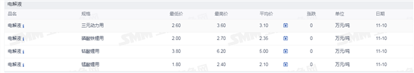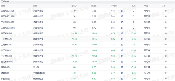 证券之星新能源车行业周报:据上海有色网,截止11月10日,电池级碳酸锂14.8-15.8万元/吨,均价15.3万元/吨,环比上一工作日下滑0.2万元/吨;工业级碳酸锂14.3-14.9万元/吨,均价14.6万元/吨,环比上一工作日下滑0.1万元/吨。上游锂盐企业更多以长单出售为主,挺价心态依旧,但个别锂盐企业随行就市小幅下调出售价格,下游正极材料企业出于降本增效策略,其散单拿货情绪也依旧低迷,近期碳酸锂现货市场成交价格仍呈现下行趋势。