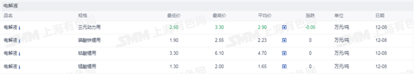 证券之星新能源车行业周报:据上海有色网,截止12月8日,电池级碳酸锂11.2-12.5万元/吨,均价11.85万元/吨,环比上一工作日下滑0.2万元/吨;工业级碳酸锂10.15-10.9万元/吨,均价10.53万元/吨,环比上一工作日下滑0.17万元/吨。12月8日市场中锂盐企业的出货情绪抬升,个别锂盐企业和正极材料以11.2万元/吨价格成交较多的电池级碳酸锂,而盐湖企业和回收锂盐企业观望情绪抬升,并无明显出货打算。近期正极材料企业询价和拿货意愿更为积极,但由于贸易企业盘面套保难以平仓而限制其销售碳酸锂现货,正极材料更多偏向于向锂盐企业采购。但目前正极材料企业反馈其订单无明显增量迹象,其在进行采购并补充碳酸锂原料库存后,对于碳酸锂的采购或也难有持续大幅放量的情况出现。