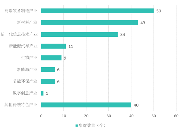 从前两批国家级中小企业特色产业集群产业分布来看,战略性新兴产业是国家级集群重点发展领域,共有160个国家级集群围绕战新产业集聚,占比达80%。其中,高端装备制造产业是战略性新兴产业的重点关注领域,共有50个集群入围。近年来国家高度关注战略性新兴产业,推进高端装备制造产业发展也是国家级中小企业特色产业集群建设的主要方向之一。新材料产业和新一代信息技术产业国家级集群数量次之,分别为43个和34个。