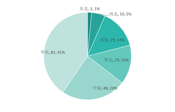 从前两批国家级中小企业特色产业集群分布来看,华东地区集群数量最多,共计81个集群入选,占比超40%。中南地区位列第二,共有48个集群入选,占比约为24%。西南和华北地区国家级集群数量相同,均为29个。西北和东北地区国家级中小企业特色产业集群数量最少,分别为10个和3个。