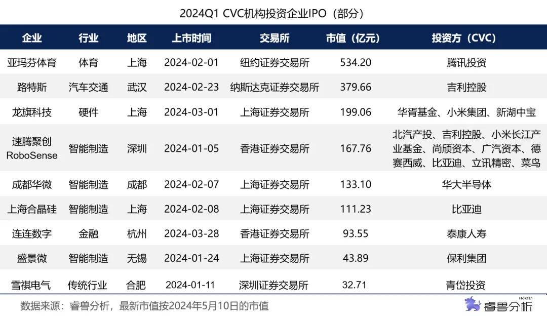 2024Q1,56家中国企业完成IPO,其中得到国内CVC机构支持的企业数量为13家,CVC渗透率为23.2%。速腾聚创得到支持的CVC数量最多,为9家,其次是龙旗科技,得到3家CVC的支持。13家获得CVC投资的IPO企业共获得21家CVC的支持,其中有2家CVC机构被投企业IPO数量超过2家,分别是吉利控股和比亚迪。