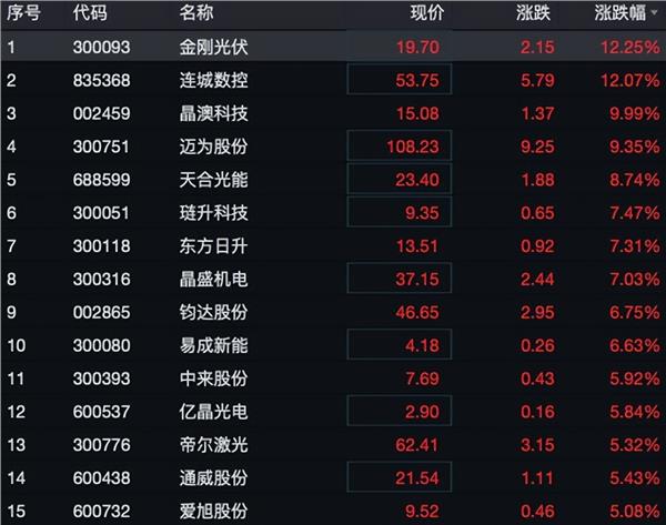 光伏板块震荡拉升,金刚光伏涨超10%,晶澳科技、迈为股份、琏升科技、东方日升等多股均涨超5%。