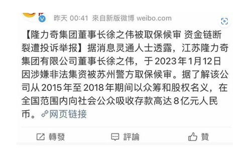 据国内媒体报道,2023年苏州市中级人民法院已受理隆力奇非法集资案,涉案金额超8亿元,董事长徐之伟等高管被取保候审。